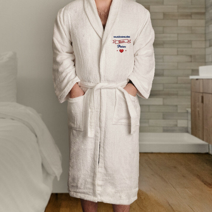 Univerzálny župan v bielej farbe, vyrobený zo 100% froté bavlny. Pohodlný, pekný, mäkký - poskytne vynikajúci komfort, keď všetky starosti dňa zmiznú a je čas relaxovať. Zahreje tiež ospalé telo ihneď po prebudení. Župan je zdobený personalizovanou výšivkou, ktorá vyzerá krásne, zlepšuje náladu a premieňa výrobok na jedinečný darček!Župan má elegantný strih s golierom a vreckami, aby ste mohli zažiariť na večernej domácej módnej prehliadke. Univerzálna veľkosť županu, hmotnosť 350 g / m2. Unisex.