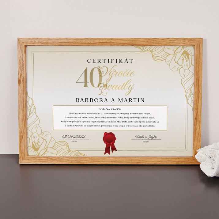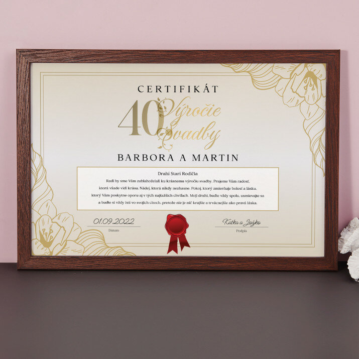 Objednal som certifikát na 40. výročie mojich rodičov na poslednú chvíľu. Neveril som, že to stihne doraziť včas. A tu veľké prekvapenie. Projekt bol pripravený bleskovo, schválil som ho a o chvíľu som dostal správu, že kurier je na ceste. Dorazilo v piatok o 12:00 a vyzeralo ešte lepšie ako na obrázku. S takýmto profesionalizmom a bleskovou realizáciou som sa ešte nestretol. Myslím si, že to nebudú moje jediné nákupy u vás. Pozdravujem! :-)