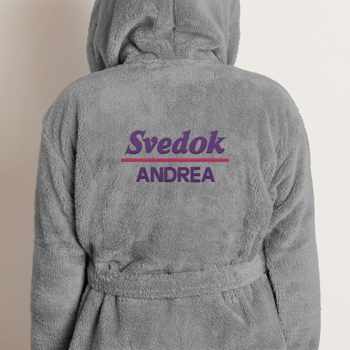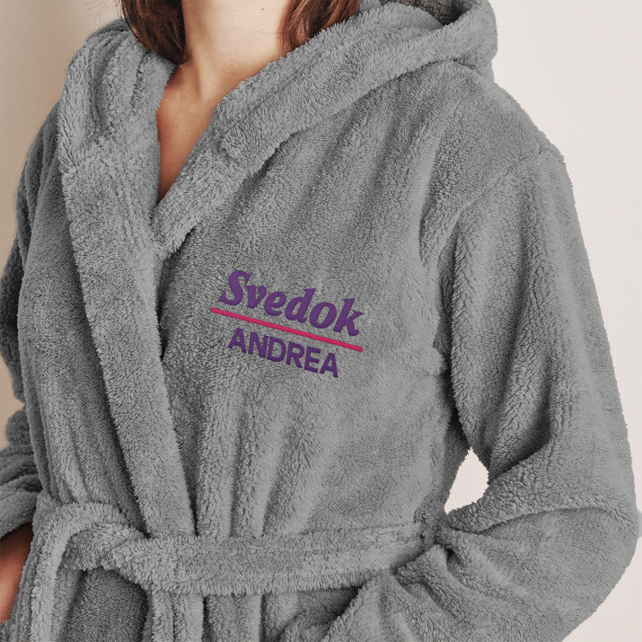 Univerzálny fleecový župan v šedej farbe, vyrobený zo 100% wellsoft polyesteru. Pohodlný, pekný, mäkký - poskytne vynikajúci komfort, keď všetky starosti dňa zmiznú a je čas relaxovať. Zahreje tiež ospalé telo ihneď po prebudení. Župan je zdobený personalizovanou výšivkou, ktorá vyzerá krásne, zlepšuje náladu a premieňa výrobok na jedinečný darček!Župan má elegantný strih s kapucňou a vreckami, aby bolo možné zažiariť na večernej domácej módnej prehliadke. Univerzálna veľkosť županu, hmotnosť 300 g / m2. Unisex.