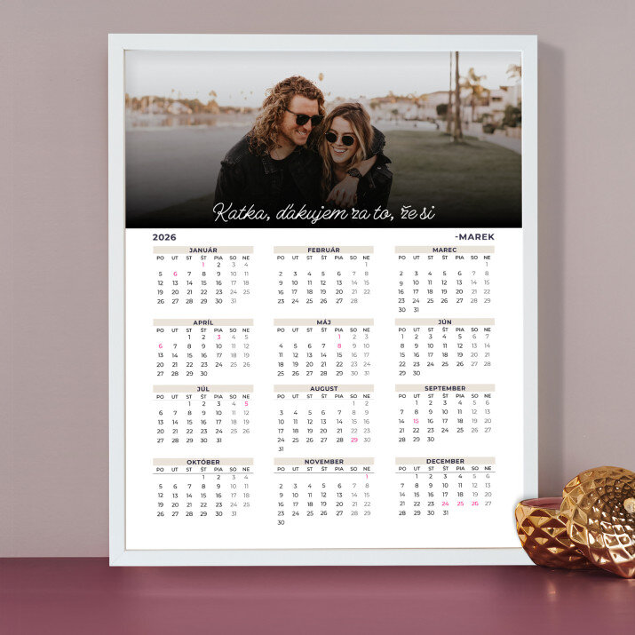 Personalizovaný kalendár v ráme je skvelým tipom na darček, ktorý dokonale zapadne do každého interiéru! Celý rok je umiestnený na jednej strane, takže usporiadanie všetkých mesiacov je okamžite viditeľné. Potlač na fotopapieri vyzerá krásne, farby sú sýte a efekt trvácny. Je to perfektný darček a pamiatka v jednom!Rozmery: 40 x 50 cm