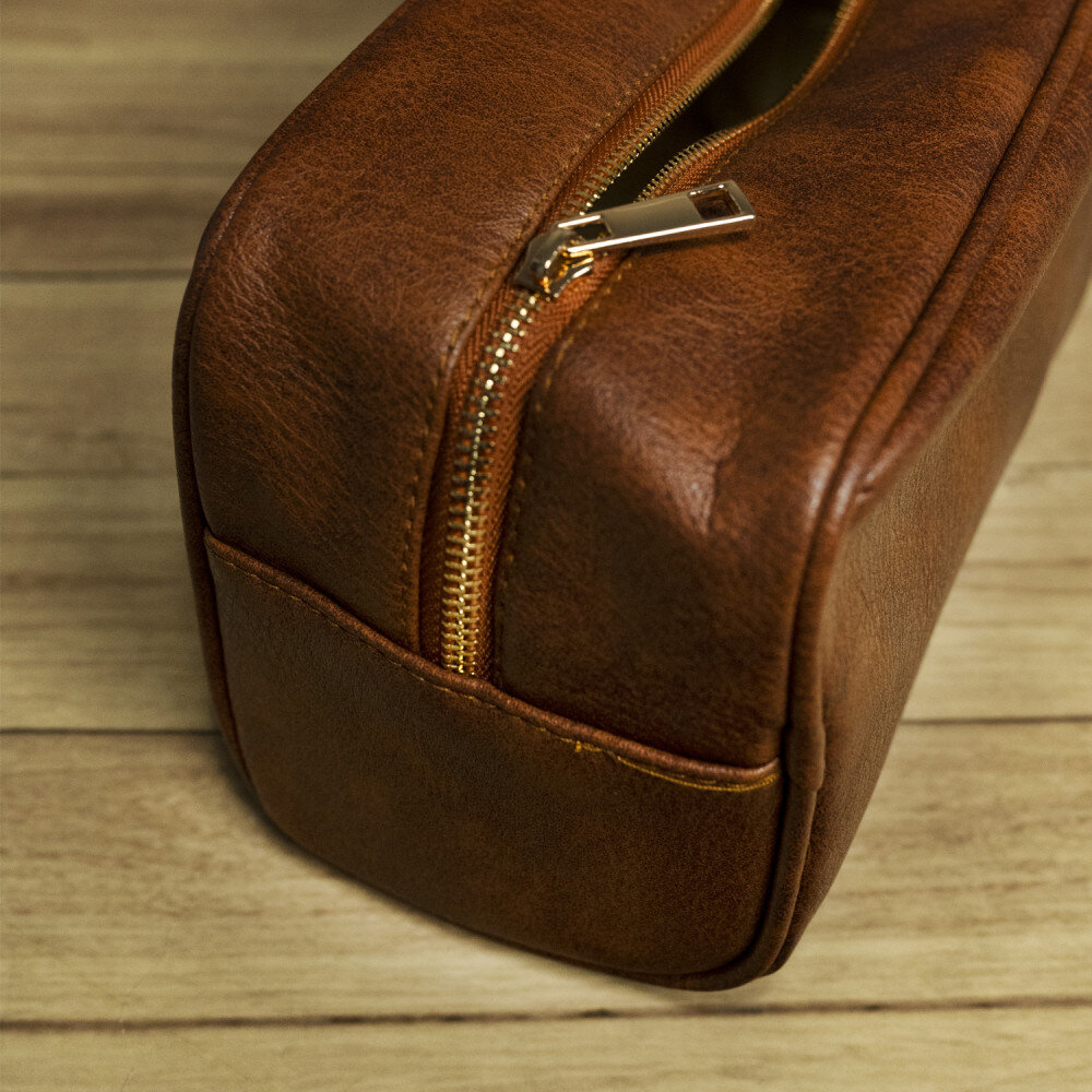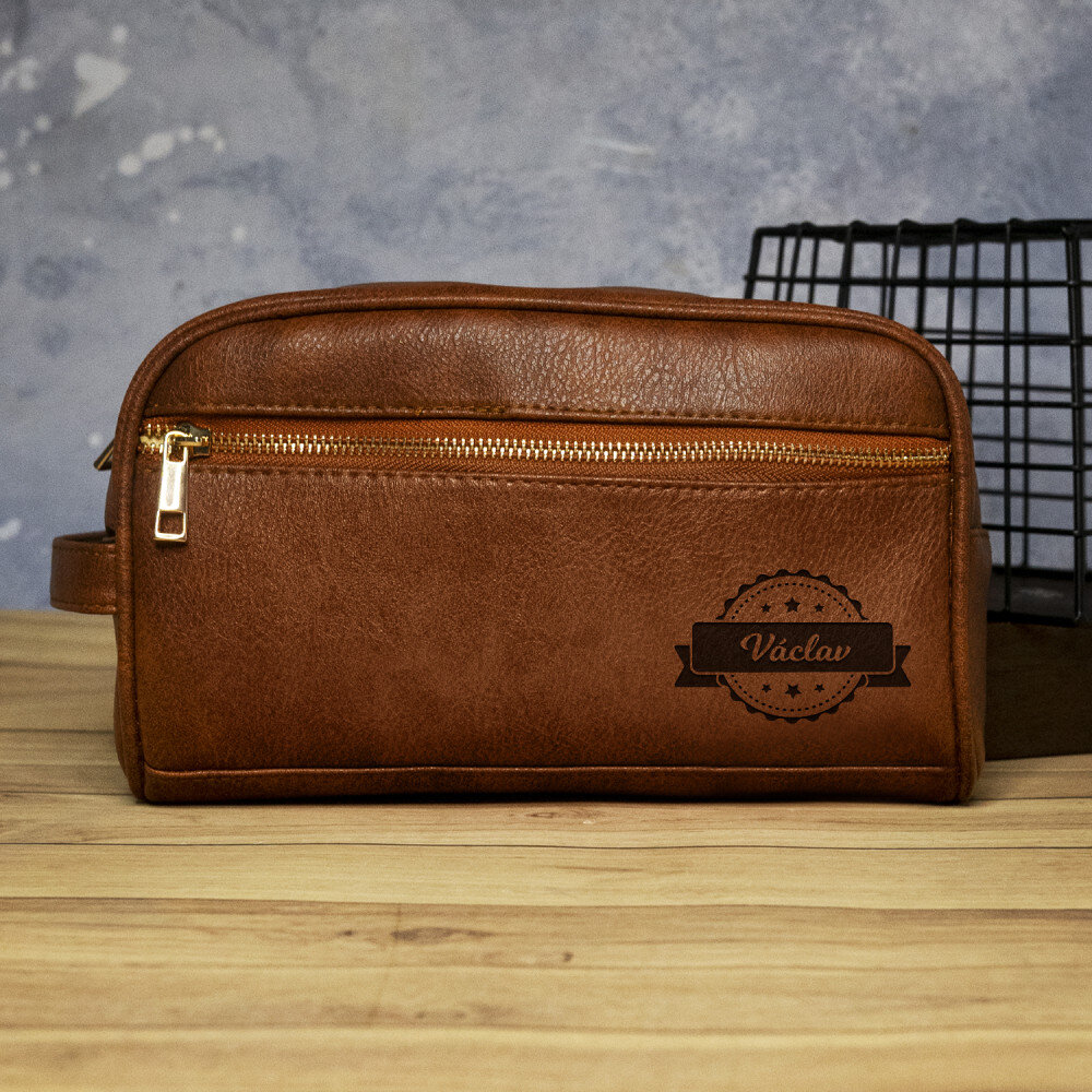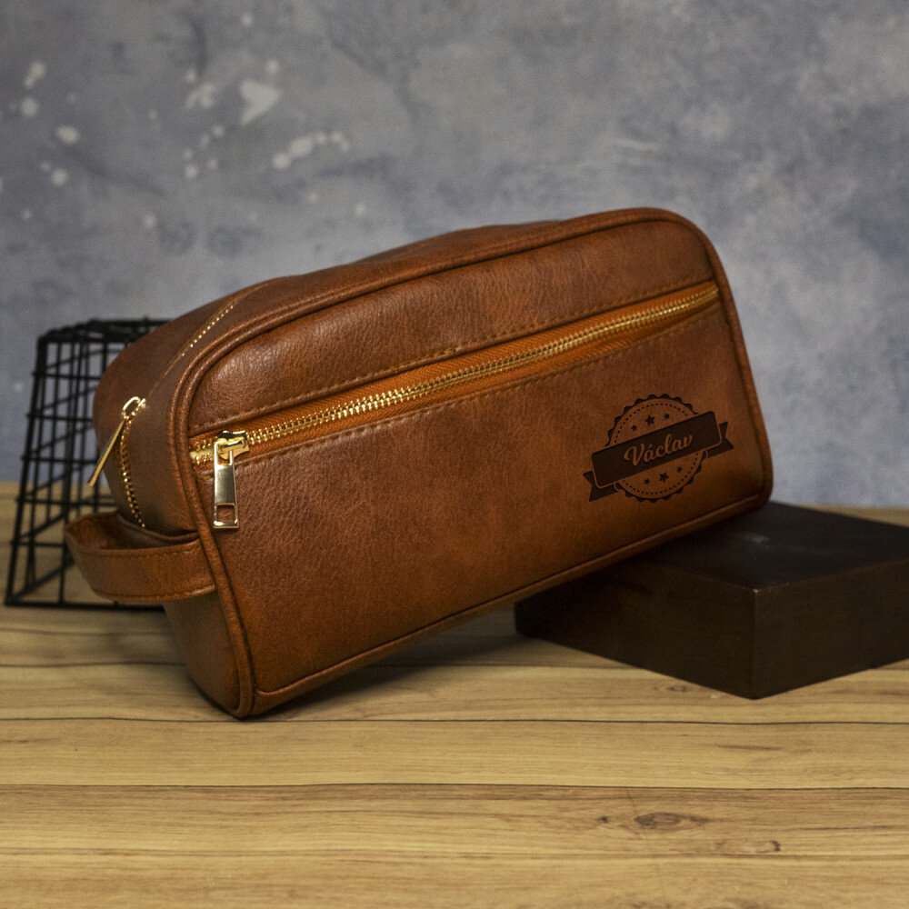 Kozmetická taštička je vyrobená z materiálu imitujúceho kožu v hnedej farbe. Kvalitná povrchová úprava zaisťuje trvanlivosť, elegantný vzhľad a odolnosť voči nečistotám. Vnútro kozmetičky je umývateľné a vyplnené podšívkou. Celok dopĺňajú kovové ozdoby. Kozmetická taštička má aj skryté vrecko. Ide o veľmi univerzálny darček, ktorý sa bude hodiť každému!