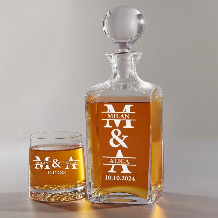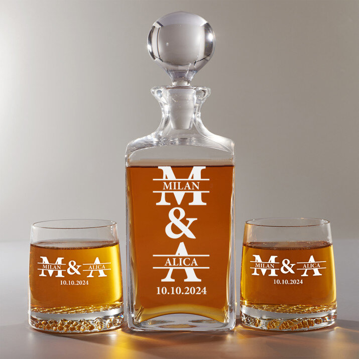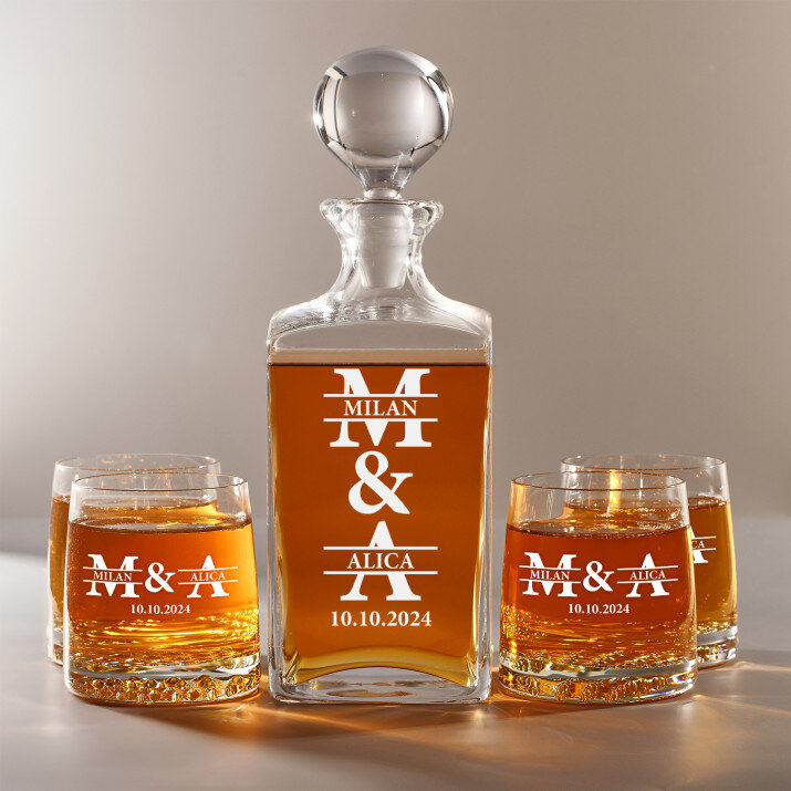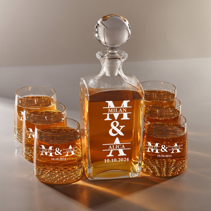 Súprava s gravírovanou karafou a pohármi je dostupná v štyroch variantoch: