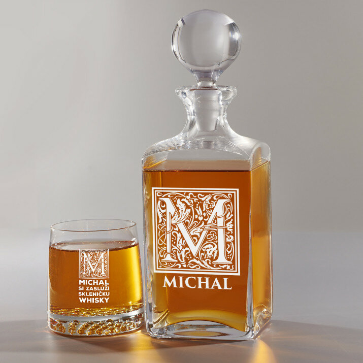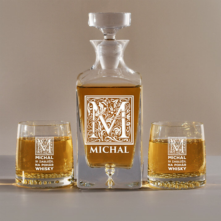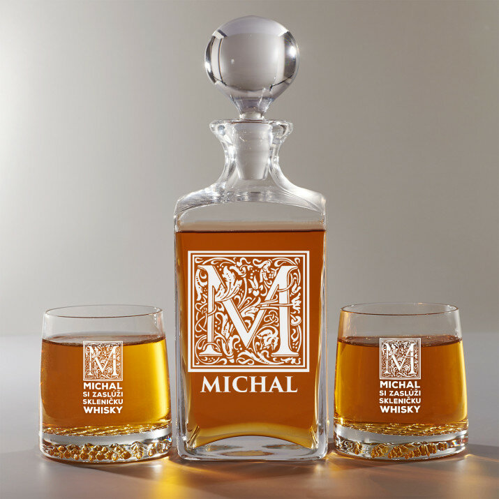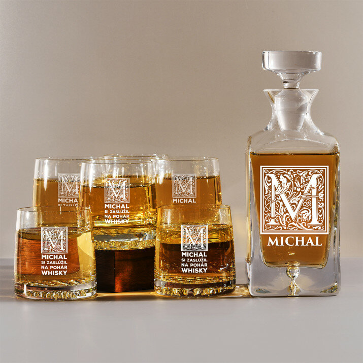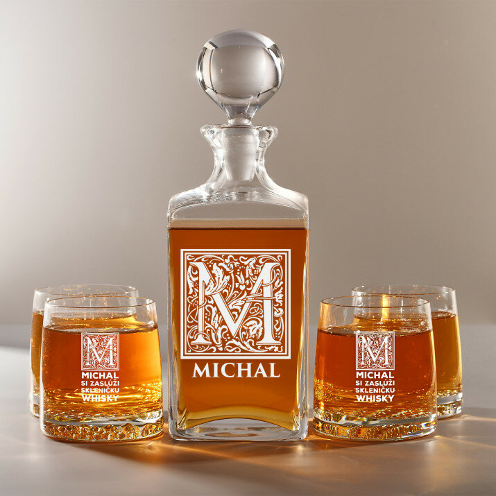Súprava s gravírovanou karafou a pohármi je dostupná v štyroch variantoch: