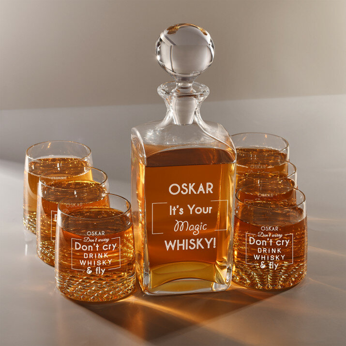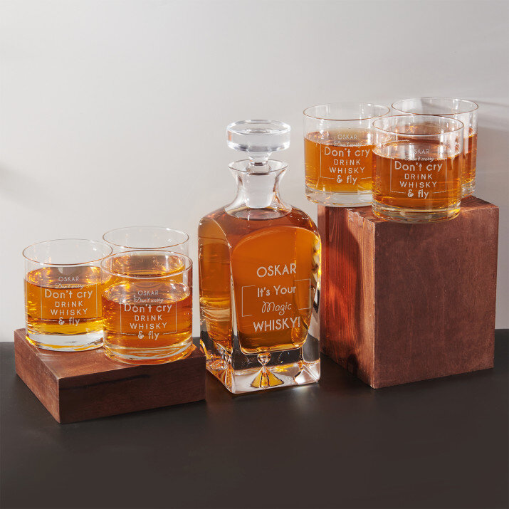 Súprava s gravírovanou karafou a pohármi je dostupná v štyroch variantoch:Karafa + 1 pohár