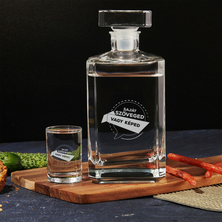 Sada s gravírovanou karafou a 6 pohárikmi na vodku.Karafa je vyrobená z vysoko kvalitného číreho skla. Vďaka jednoduchému tvaru a elegantnej povrchovej úprave bude výrobok vyzerať elegantne v každom bariku. Štvorcový tvar láme svetlo, čo krásne zvýrazňuje farbu nápoja. Objem karafy je 700 ml, výška 19,5 cm a šírka 8,5 cm.