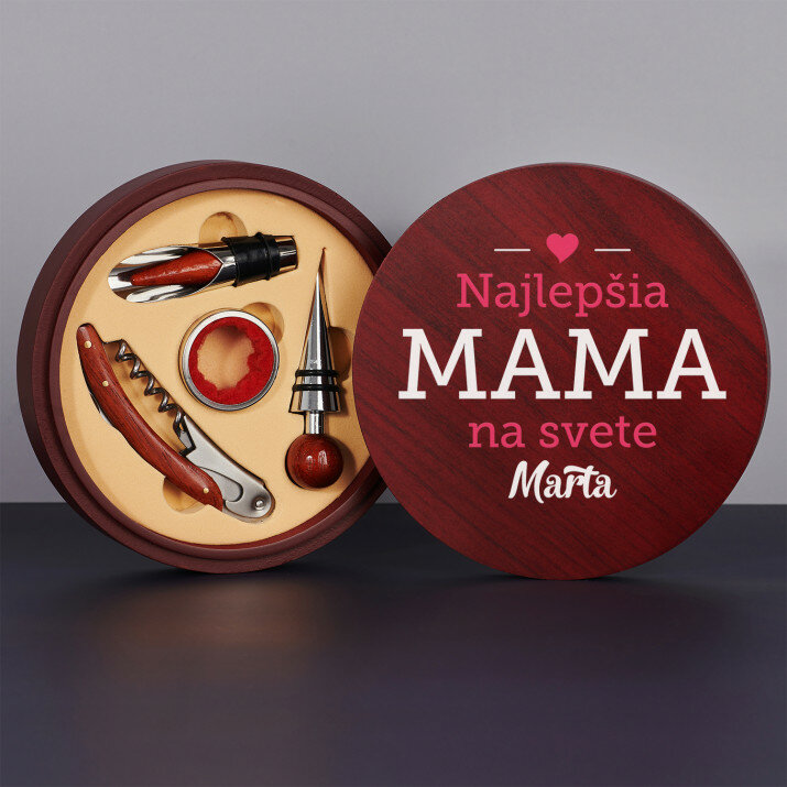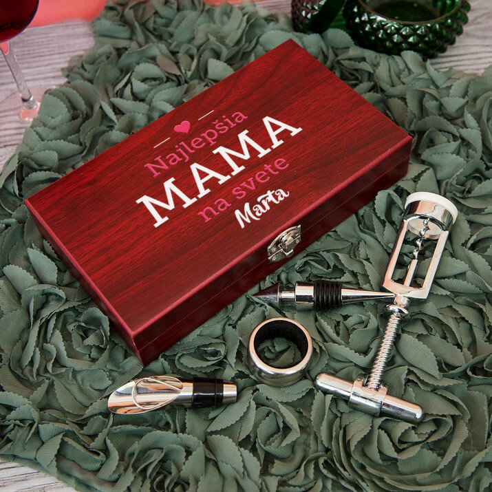 Krásna štvordielna súprava na víno v elegantnej drevenej škatuľke s gravírovaním na veku.Na výber sú dve verzie: