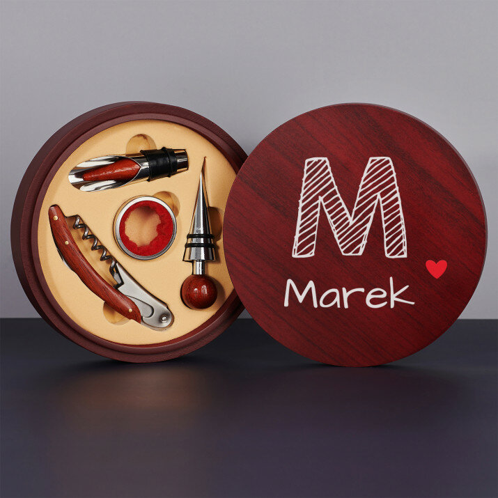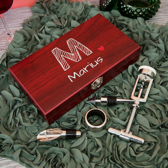 Krásna štvordielna súprava na víno v elegantnej drevenej škatuľke s gravírovaním na veku.Na výber sú dve verzie: