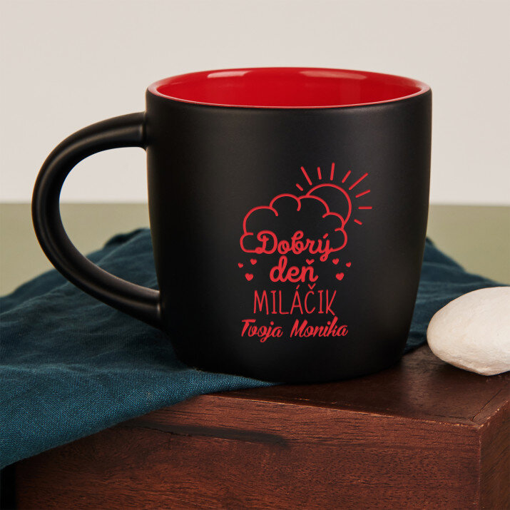 Štýlový keramický hrnček s jedinečnou potlačou. Jeho vysoko kvalitné remeselné spracovanie a elegantná povrchová úprava z neho robia perfektný darček na mnoho príležitostí. Hrnček je dostupný v čiernej farbe s jedinečným červeným vnútrom.