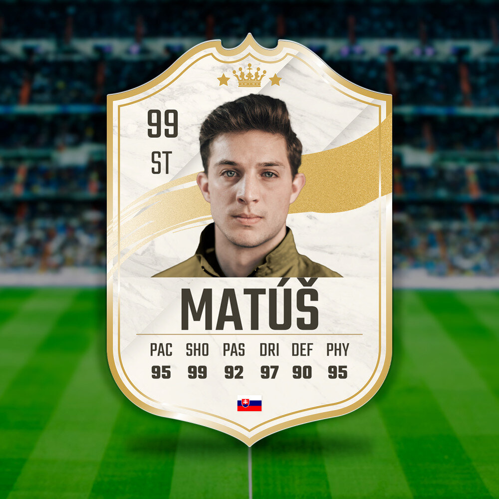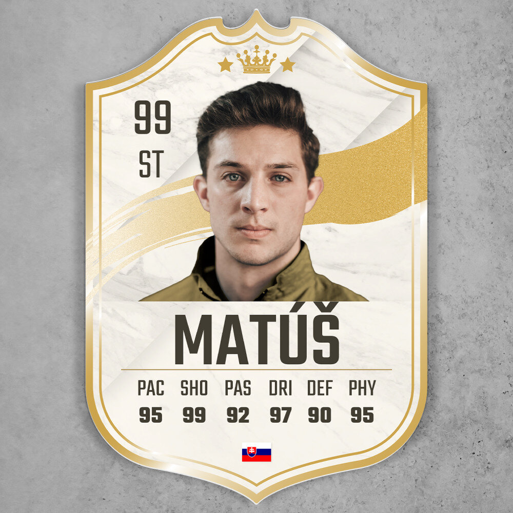 Jedinečný darček pre športových fanúšikov, ktorý obdarovaného poteší! Tlač na 3 mm hrubom, bezfarebnom akrylovom skle (plexisklo) v tvare karty, je darček, ktorý vydrží roky. Materiál sa vyznačuje vynikajúcou kvalitou povrchu, tuhosťou, je odolný voči poškodeniu a poveternostným vplyvom. Karta hráča je dodávaná so suchým zipsom, takže výtlačok je možné pripevniť na stenu!