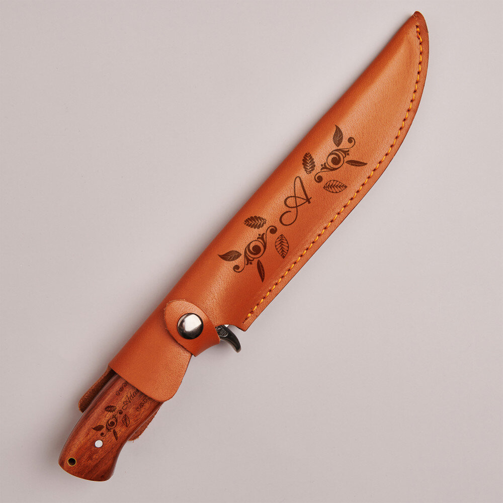 Jednočepeľový lovecký nôž podpísaný značkou TASMAN, ktorý si zakladá na jednoduchosti dizajnu, kvalitných materiáloch a starostlivom spracovaní. Vďaka tomu nás nôž nikdy nesklame a bude fungovať za každých podmienok. Nôž má hnedú drevenú rukoväť a elegantné puzdro z prírodnej kože. Personalizácia sa nachádza na rukoväti a puzdre.Technické údaje: