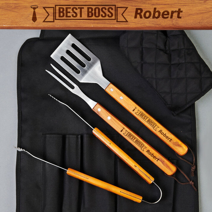 Sada nástrojov na grilovanie z dreva a kovu obsahuje aj rukavicu a zásteru, ktorá slúži ako puzdro. Celok vyzerá skvele a bude dokonalým darčekom! Na náradie bude umiestnené personalizované gravírovanie, ktoré premení praktickú súpravu na jedinečný darček.
