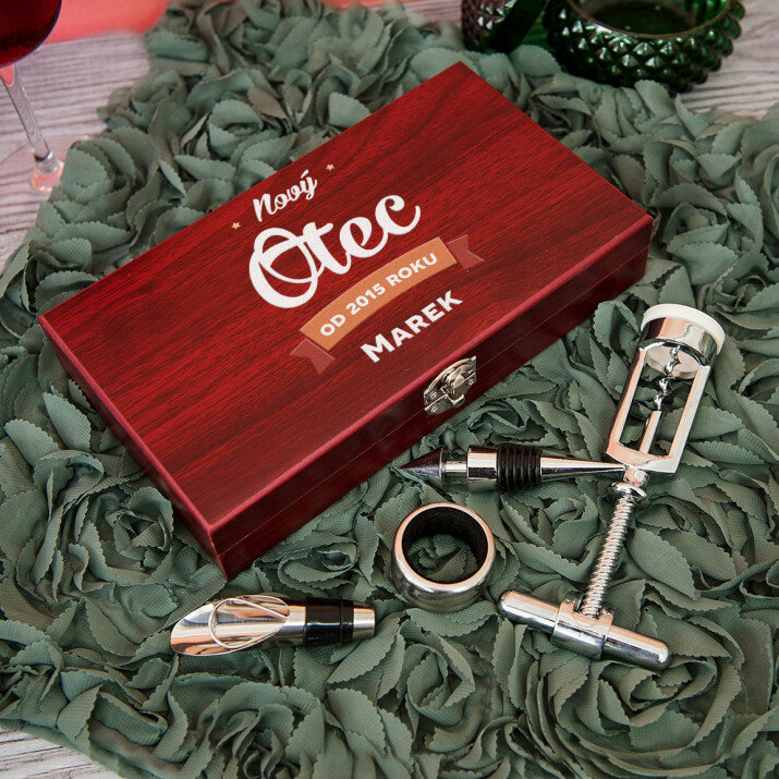 Krásna štvordielna súprava na víno v elegantnej drevenej škatuľke s gravírovaním na veku.Na výber sú dve verzie: