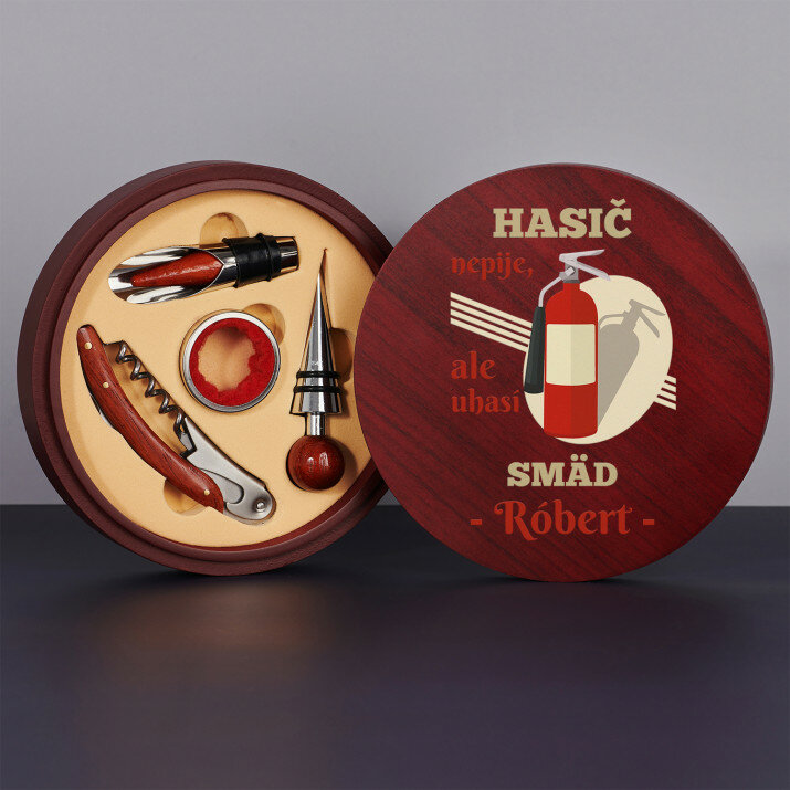 Krásna štvordielna súprava na víno v elegantnej drevenej škatuľke s gravírovaním na veku.Na výber sú dve verzie: