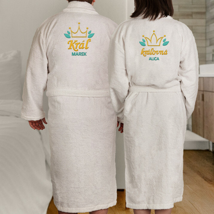 Dva univerzálne župany v bielej farbe, vyrobené zo 100% froté bavlny. Pohodlné, pekné, mäkké - poskytnú vynikajúci komfort, keď všetky starosti dňa zmiznú a je čas relaxovať. Ihneď po prebudení tiež zahrejú ospalé telá. Župany sú zdobené personalizovanou výšivkou, ktorá vyzerá krásne, zlepšuje pohodu a premieňa výrobok na jedinečný darček!Každý župan má elegantný strih s golierom a vreckami, takže na večernej domácej módnej prehliadke môžeš zažiariť. Univerzálna veľkosť županu, hmotnosť 350 g/m2. Unisex.