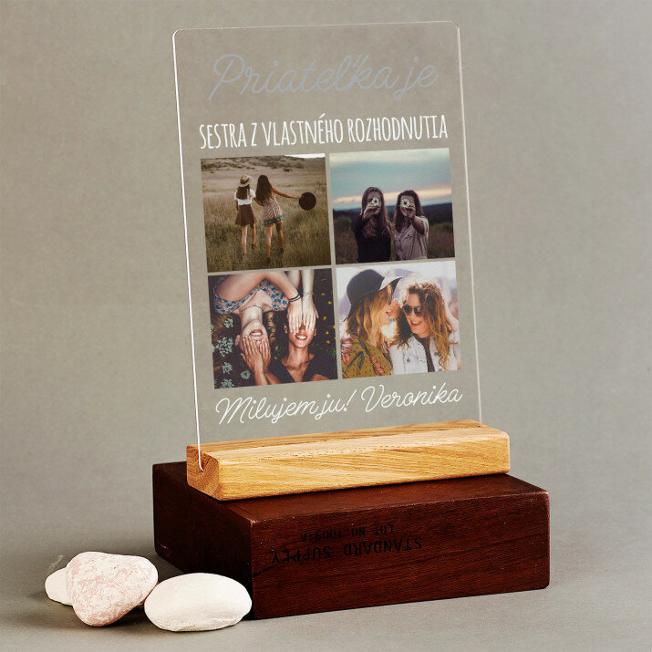 Výnimočná pamiatka, ktorá poteší obdarovaného! Výtlačok na priehľadnom akrylovom skle (plexisklo) s hrúbkou 2 mm je darček, ktorý bude robiť radosť mnoho rokov. Produkt je vyrobený z vysokokvalitných materiálov a je odolný voči poškodeniu alebo poveternostným vplyvom. Vďaka elegantnému drevenému stojanu môžeš výtlačok umiestniť na poličku. Garantujeme, že to bude skvelé prekvapenie pre Tvojich blízkych!Rozmery skla: 21 x 12,5 cm