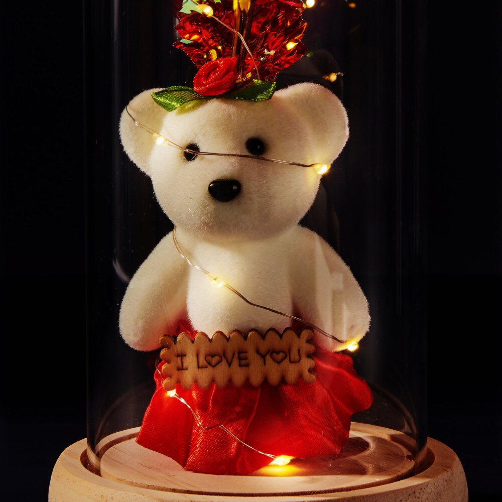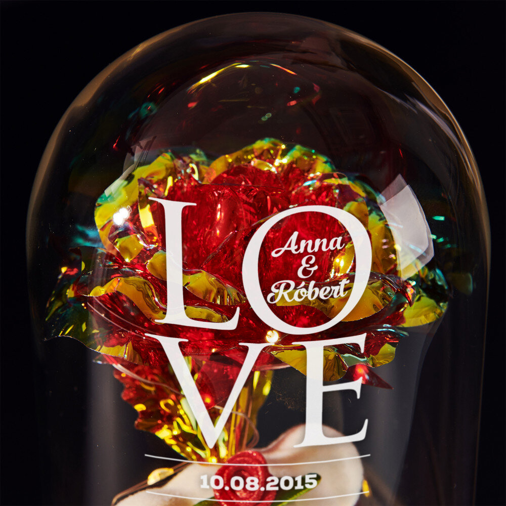 Večná ruža s medvedíkom pod sklenenou kupolou je jedinečný darček, ktorý je možné darovať k mnohým príležitostiam. Je to krásny a trvalý darček, ktorý sa stane skvelou pamiatkou na roky! Odolná, priehľadná kupola chráni jemnú ružu a rozkošného medvedíka a dodáva darčeku elegantný vzhľad. Stojan zaisťuje stabilitu a odolnosť celej kompozície. LED svetlá umiestnené vo vnútri ruže vytvárajú romantickú atmosféru. Na povrch sklenenej kupoly je možné pridať gravírované iniciály, meno alebo krátky odkaz, aby bol tento darček ešte výnimočnejší. Večná ruža sa dodáva v darčekovej krabičke.Svetlá napájané batériami 1,5V AAA