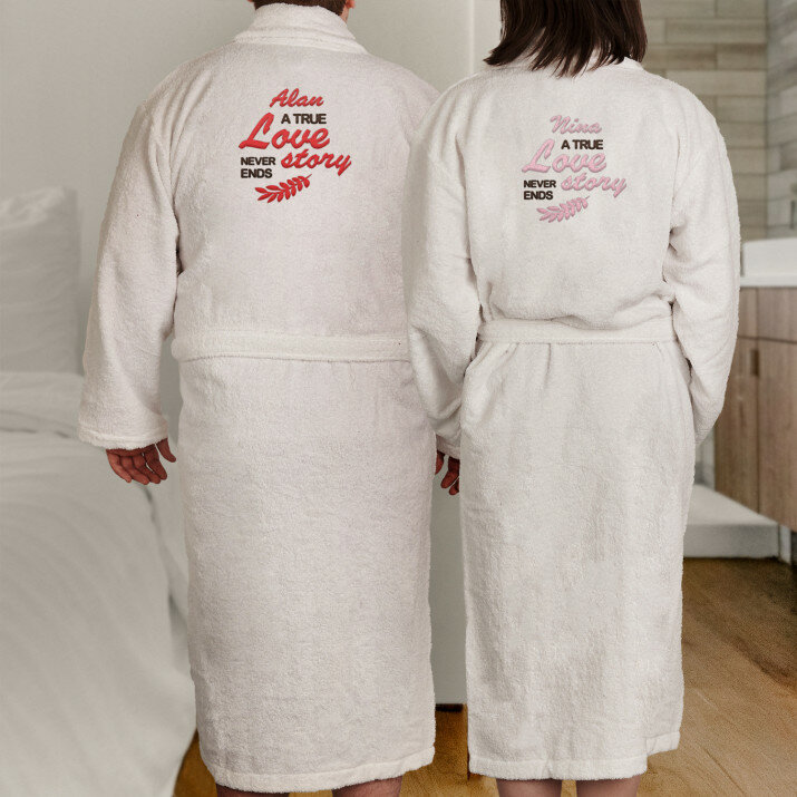 Dva univerzálne župany v bielej farbe, vyrobené zo 100% froté bavlny. Pohodlné, pekné, mäkké - poskytnú vynikajúci komfort, keď všetky starosti dňa zmiznú a je čas relaxovať. Ihneď po prebudení tiež zahrejú ospalé telá. Župany sú zdobené personalizovanou výšivkou, ktorá vyzerá krásne, zlepšuje pohodu a premieňa výrobok na jedinečný darček!